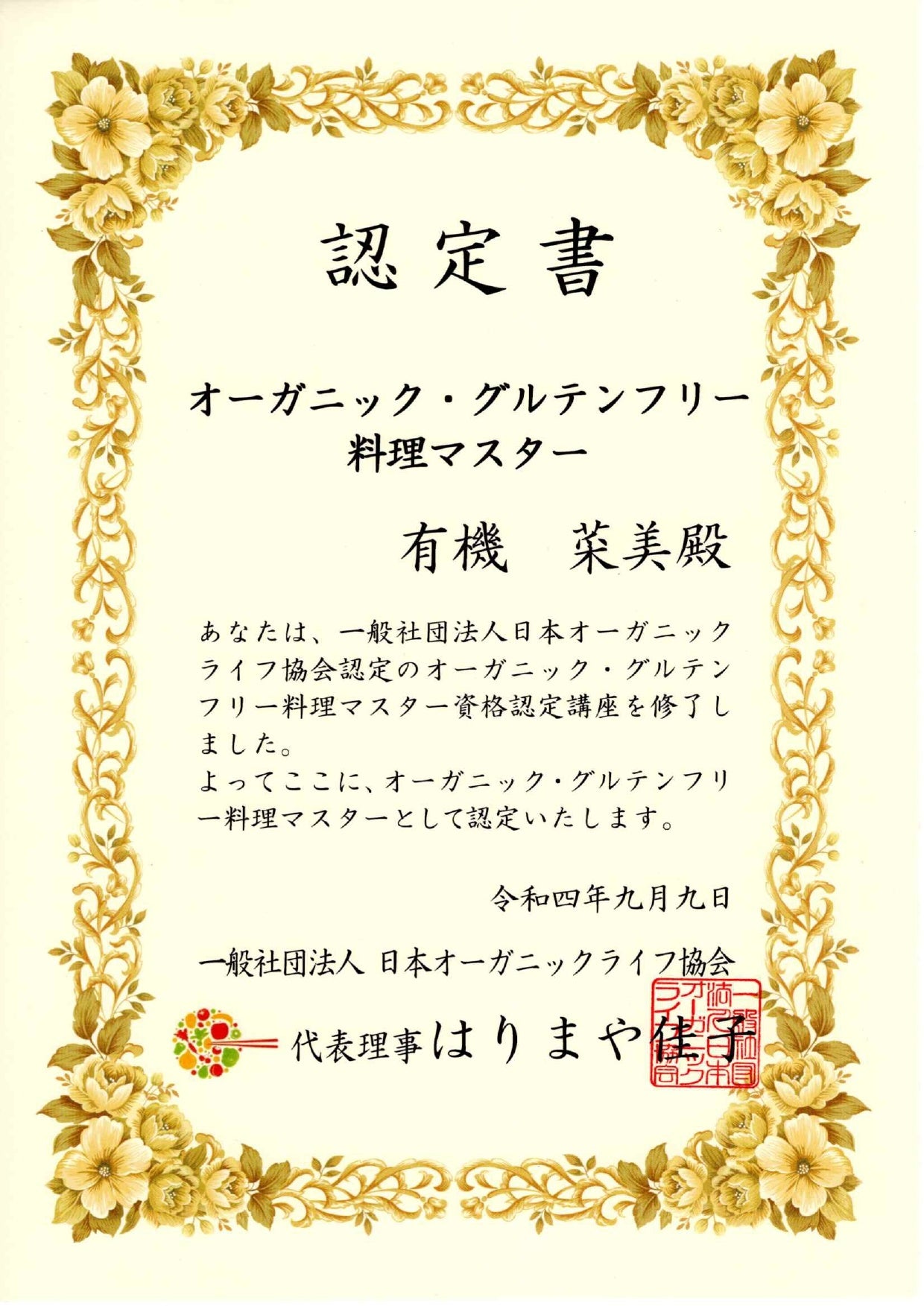 ※受講された方には、一般社団法人日本オーガニックライフ協会より、「オーガニック・グルテンフリー料理マスター」の資格認定書をお渡しいたします。