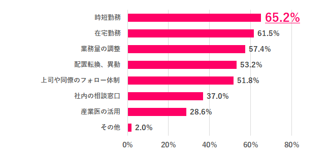 休職明けにあったらいいと思う制度やサポートは、1位「時短勤務」65.2%、2位「在宅勤務」61.5%、「業務量の調整」57.4%となっています。メンタル不調に陥った原因でも、「職場の人間関係」や「業務量の過多」が上位だったため、時短などの柔軟な働き方や、職場と距離が取れる在宅勤務などが求められている実態が見て取れました。