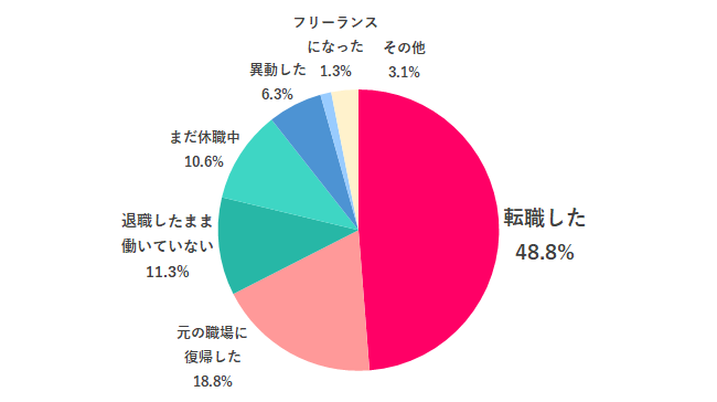 休職期間終了後はどうしたかを尋ねてみると、「転職した」が1位で48.8%でした。2位は「元の職場に復帰した」18.8%ですが、「退職したまま働いていない」や「まだ休職中」もそれぞれ10%程度おり、いまだ休職から復帰できていない人もある程度の割合を占める結果となりました。