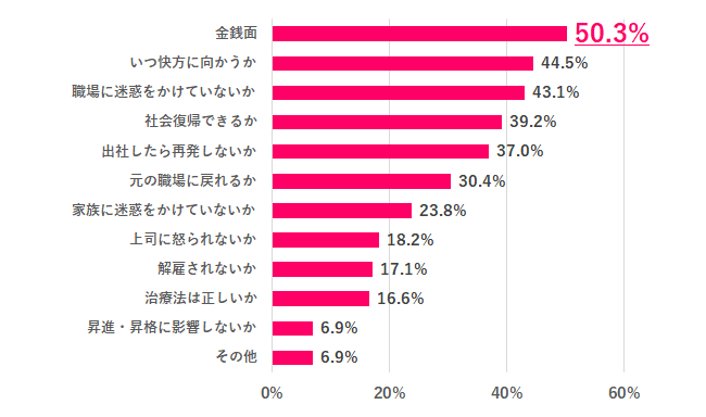 2位以降は「いつ快方に向かうか」44.5%、「職場に迷惑をかけていないか」43.1%、「社会復帰できるか」39.2%が続いています。その他の意見としては、「異動できるか」「転職できるか」などがありました。