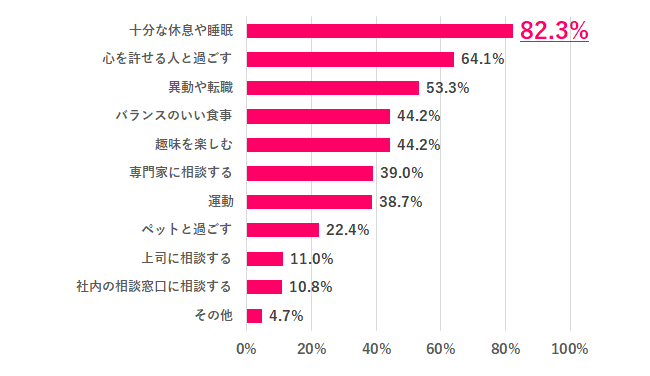 メンタル不調を乗り越えるために必要なことは、「十分な休息や睡眠」が82.3%で圧倒的1位でした。次いで「心を許せる人と過ごす」64.1%、「異動や転職」53.3%、「バランスのいい食事」44.2%と続いており、リラックスすることや環境を変えることが大切だと思う人が多いようです。