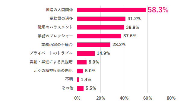メンタル不調に陥った原因は、1位「職場の人間関係」58.3%、2位「業務量の過多」41.2%、3位「職場のハラスメント」39.8%となりました。その他の意見としては、「コロナ」「育児との両立」「不妊治療」などがありました。