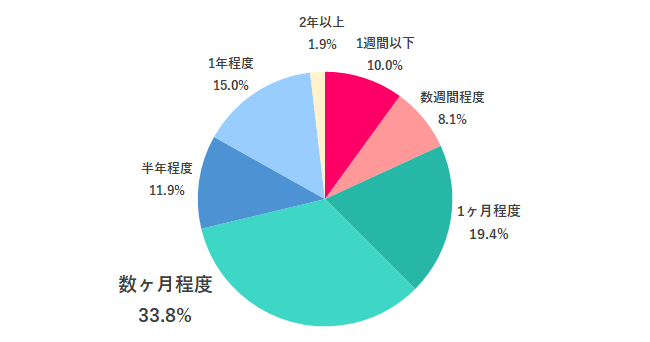 Q.2で「休職したことがある」と回答した人に、どの程度休んだかを尋ねると、1位「数カ月程度」33.8%、2位「1カ月程度」19.4%、3位「1年程度」15.0%でした。約3割の人が半年以上と休職が長期化していることもわかります。