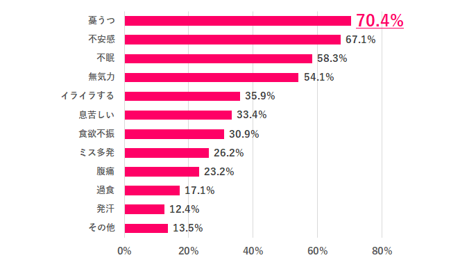 メンタル不調時の症状は、1位「憂うつ」70.4%、2位「不安感」67.1%、3位「不眠」58.3%となりました。その他の意見としては、「過呼吸」「頭痛」「めまい」などがありました。