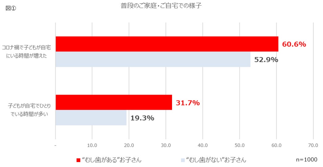 【普段のご家庭・ご自宅での様子】について質問したところ、「コロナ禍で子どもが自宅にいる時間が増えた」と回答した人は“むし歯がある”お子さんのうち 60.6%、“むし歯がない”お子さんのうち 52.9%。「子どもが自宅にひとりでいる時間が多い」と回答した人は、“むし歯がある”お子さんのうち 31.7%、“むし歯がない”お子さんのうち 19.3%という結果でした。[図①]