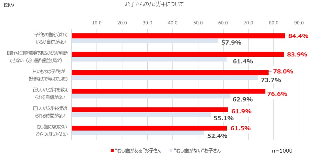 【お子さんのハミガキについて】の質問で“むし歯がある”お子さんの保護者の回答は、1位が「子どもの歯を守れているか自信がない(84.4%)」、2位が「良好な口腔環境であるかどうか判断できない(むし歯や歯並びなど)(83.9%)」、3 位が「甘いものは子どもが好きなので与えてしまう(78.0%)」、4 位が「正しいハミガキを教えられる自信がない(76.6%)」、5位が「正しいハミガキを教えられる時間がない(61.9%)」、6位が「むし歯になりにくいおやつがわからない(61.5%)」という結果となりました。[図③]
