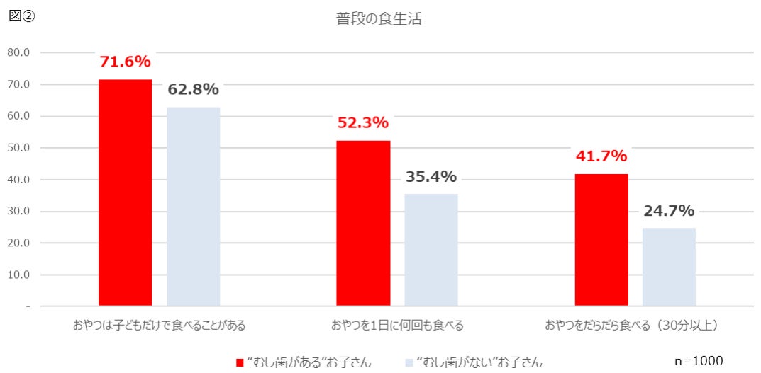 そんな環境の変化がある中【普段の食生活】の質問では、「おやつは子どもだけで食べることがある」と回答した人は“むし歯がある”お子さんのうち 71.6%でした。また、「おやつを 1 日に何回も食べる」と回答したのは、“むし歯がある”お子さんのうち52.3%で、“むし歯がない”お子さんのうち 35.4%という結果との差がでました。「おやつをだらだら食べる」と回答したのも、“むし歯がある”お子さんのうち 41.7%で、“むし歯がない”お子さんのうち 24.7%という結果とこちらも差がみられます。[図②]