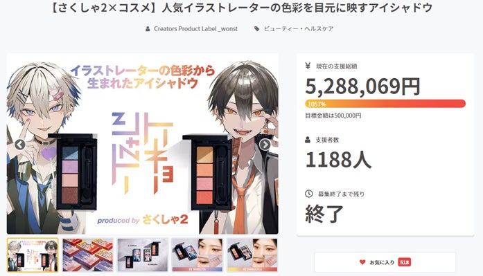 第一弾として、Z世代に絶大な人気を誇り、フォロワー80万人越えの超人気イラストレーター「さくしゃ2」とのコラボコスメ化粧品を開発し、アイシャドウシリーズ「トーキョーシャドー」をクラウドファンディングCAMPFIREにて販売し、販売開始後1時間で目標金額に達成し、目標金額の1,000%以上、1,100名以上の応援をいただきました。