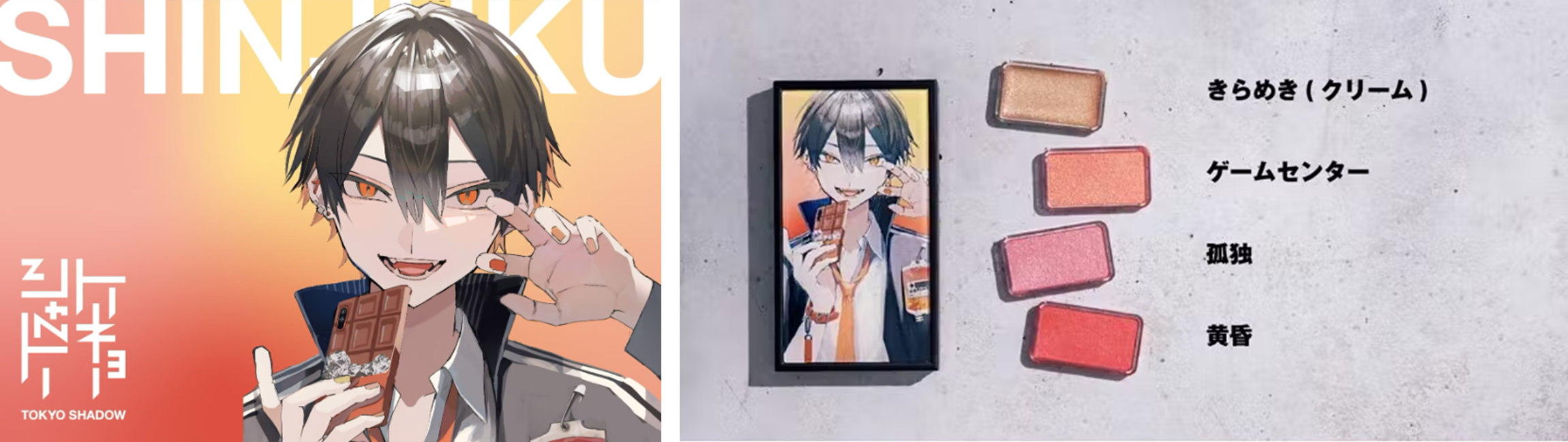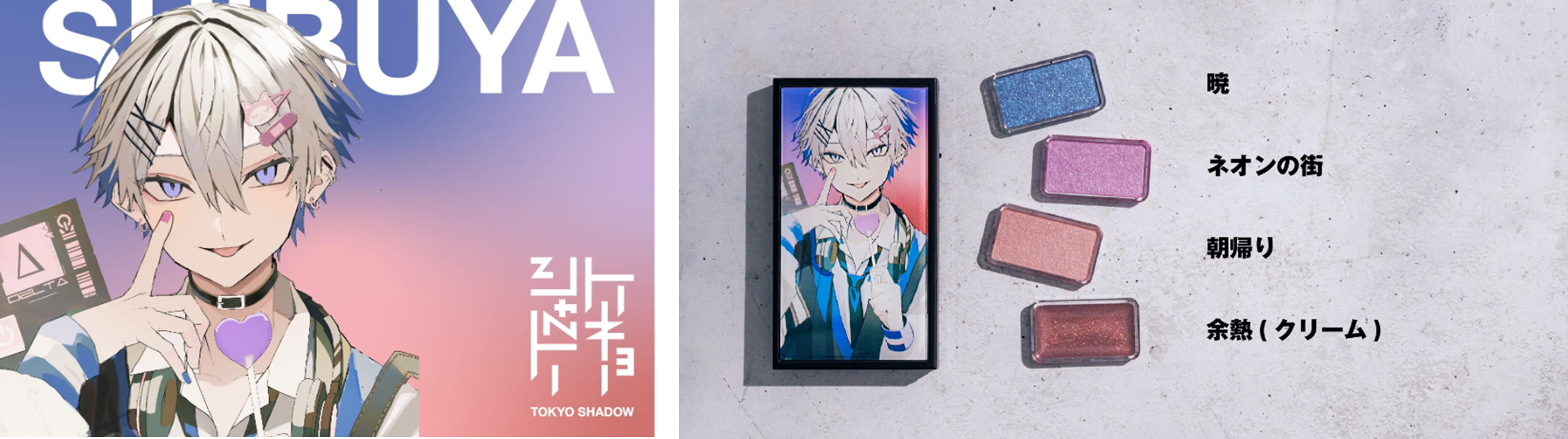 今回開発したアイシャドーシリーズのコンセプトは「ストリートの刹那」。東京のストリートカルチャーを代表する街「渋谷」と「新宿」が垣間見せる幻想的な一瞬をテーマに、さくしゃ2さんの作品世界のエッセンスとなるカラーを抽出し、4色のグラデーションパレットをつくりあげました。