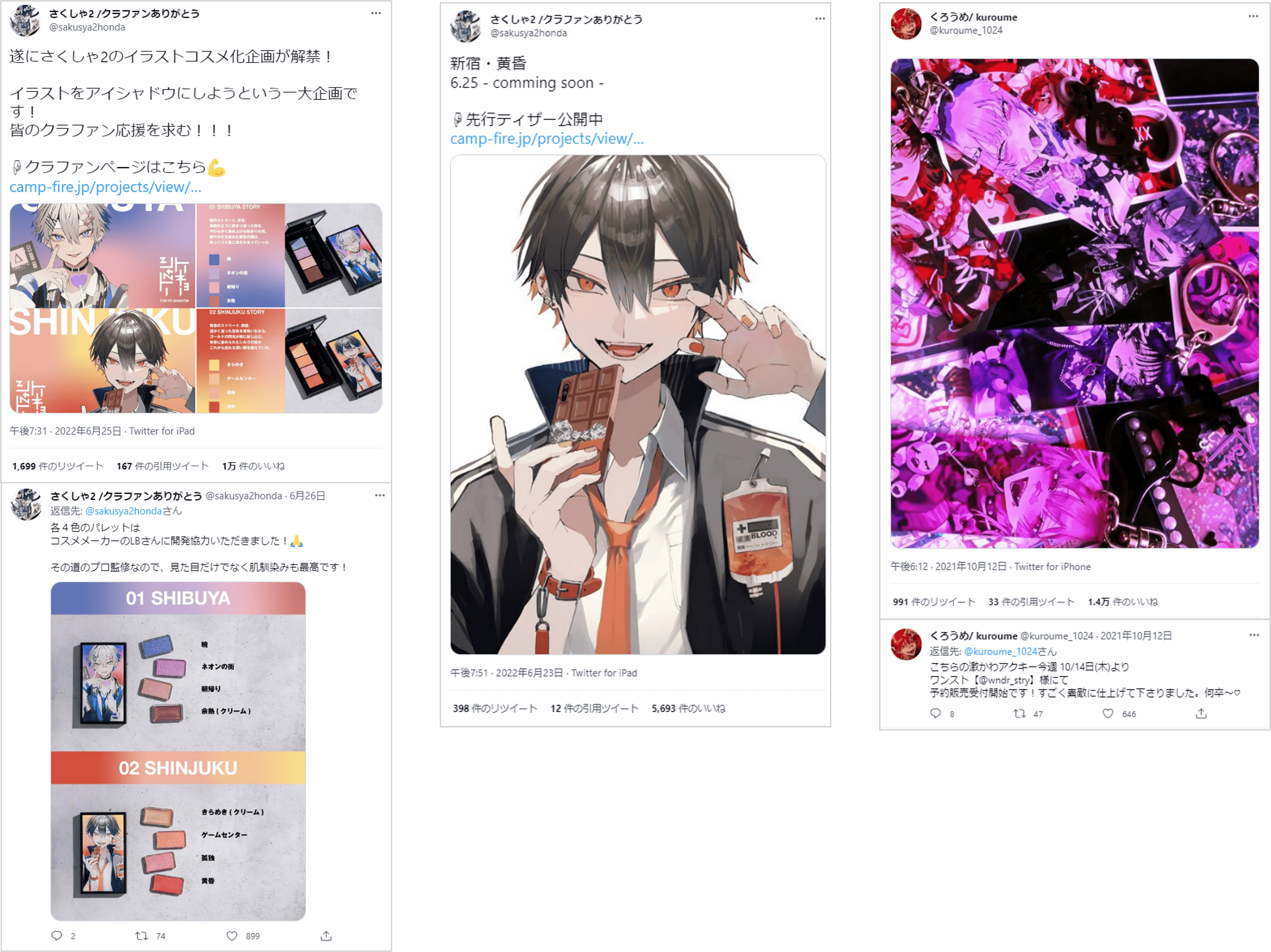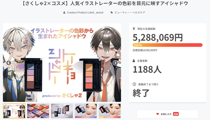 第一弾として、Z世代に絶大な人気を誇り、フォロワー80万人越えの超人気イラストレーター「さくしゃ2」とのコラボコスメ化粧品を開発し、アイシャドウシリーズ「トーキョーシャドー」をクラウドファンディングCAMPFIREにて販売し、販売開始後1時間で目標金額に達成し、目標金額の1,000%以上、1,100名以上の応援をいただきました。