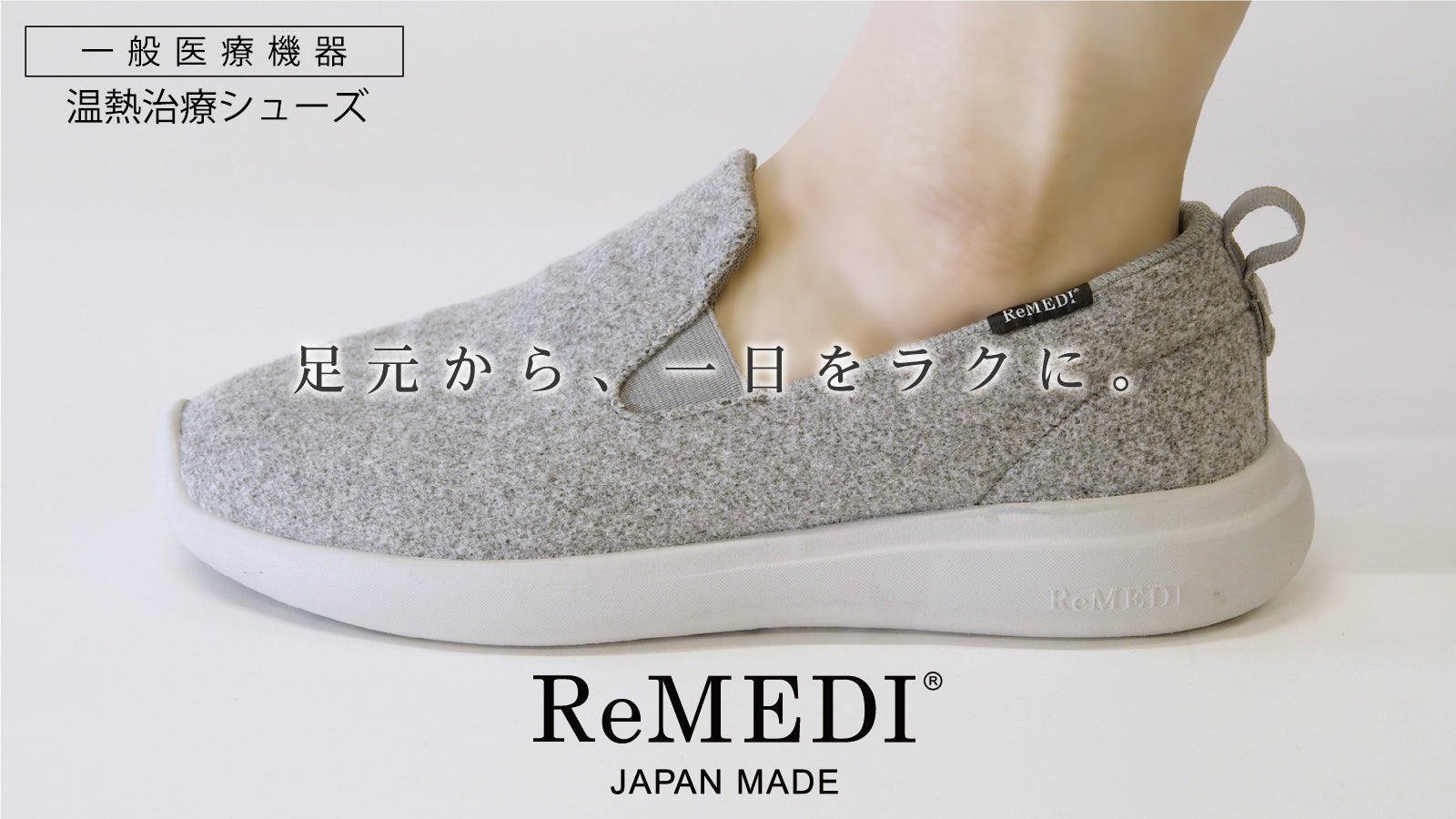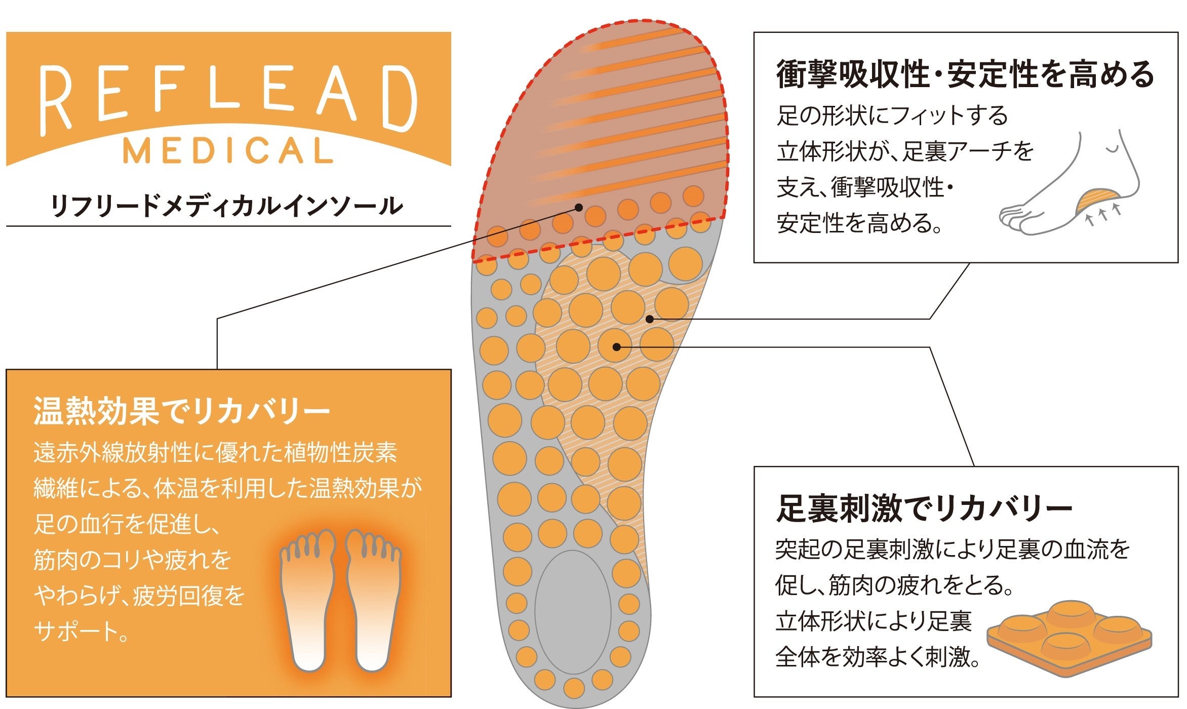 レメディの温熱治療タイプは、遠赤外線放射性に優れた植物性炭素繊維を使用した温熱治療インソール(リフリードメディカルインソール)による、体温を利用した温熱効果が足の血行を促進し、筋肉のコリや疲れを和らげることで、アクティブな毎日をサポートします。