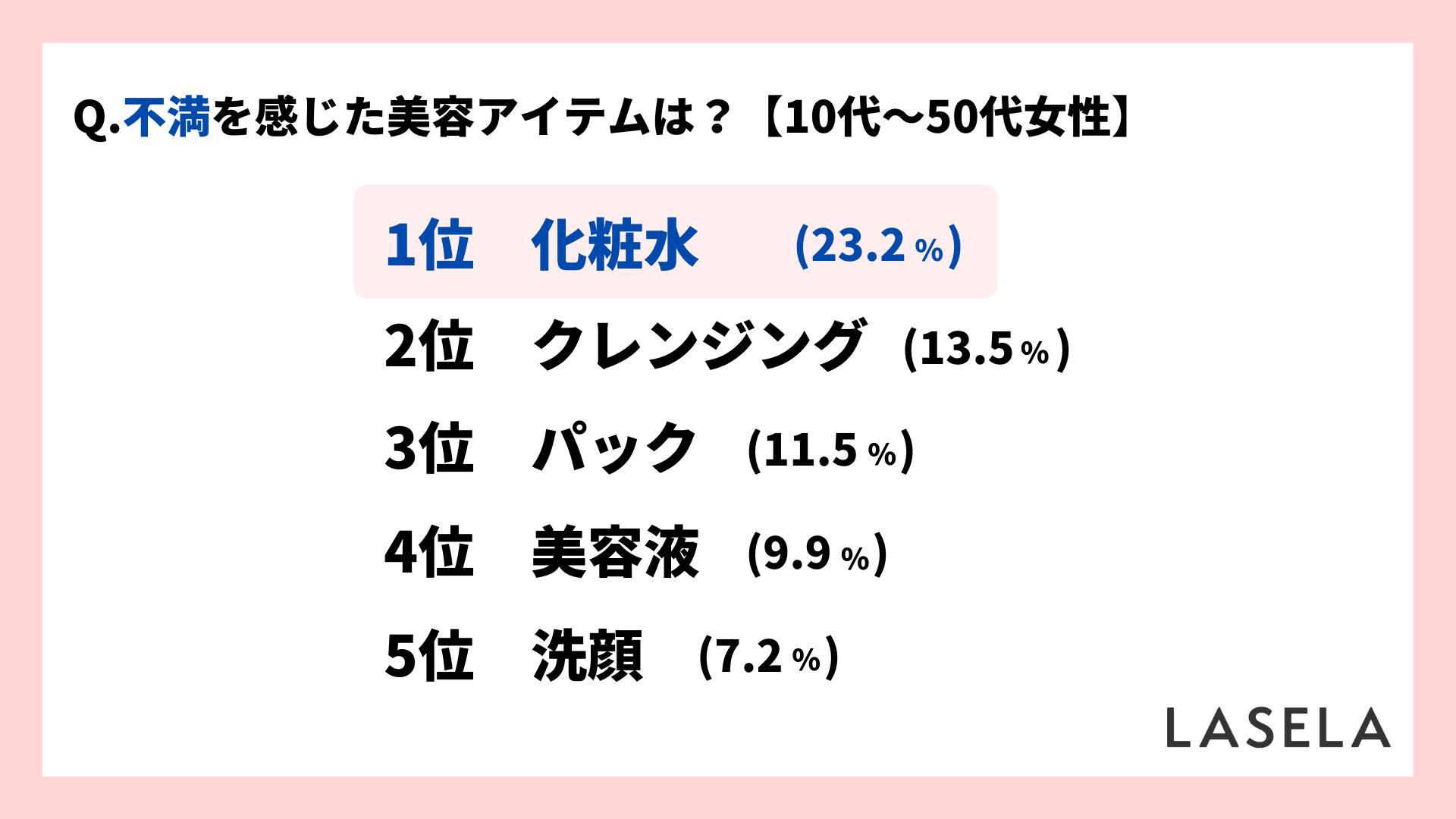- 不満を感じたアイテムTOP3は「化粧水」「クレンジング」「パック」