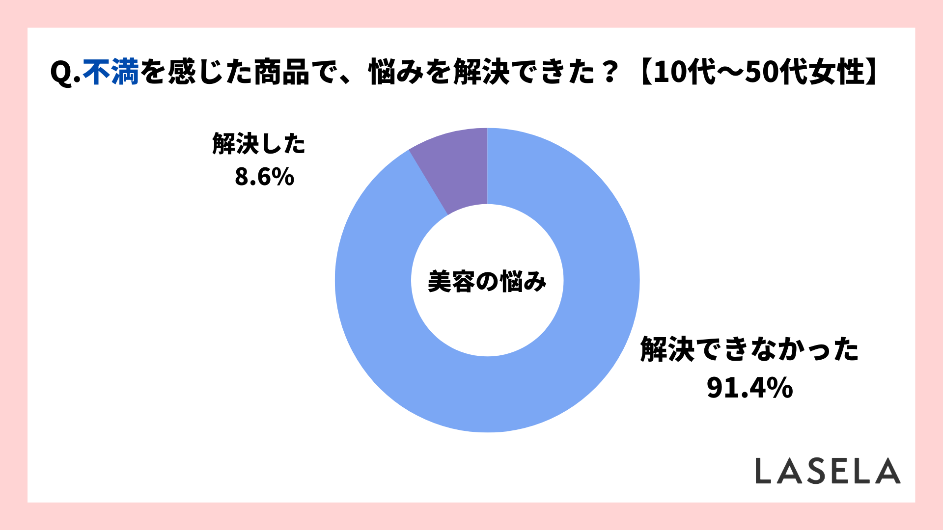 不満を感じた美容商品で悩みを解決できた人は8.6%で、全体の1割未満であることから、悩みを解決できなかったことが商品に対する不満に直結していると考えられます。