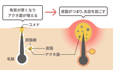 思春期にできるニキビは皮脂の過剰な分泌が原因ですが、大人になってからできるニキビは原因が複合的でさまざまな要素が絡んでいます。ニキビは皮脂が毛穴につまり、皮脂を栄養源にしている「アクネ菌」と呼ばれるものが過剰に増殖することで、炎症を起こしてできます。