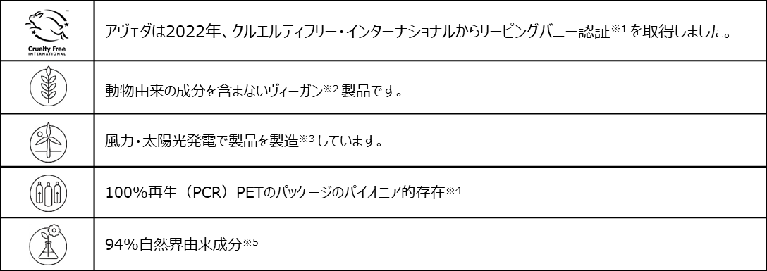 ※1 リーピングバニー認証とは、製品開発~製造工程で動物実験を行っていないブランドに付与される、国際的に認められている最高水準の認証です。※2 動物実験を行わず、動物由来の成分を配合していません。※3 製品の製造には、(米国の)再生可能エネルギークレジットやカーボンオフセットを通じてアヴェダの太陽電池や風力エネルギーによる電力が供給されています。更に、工場施設において、2023年末までに、ULスキームによるごみ廃棄場のシルバーゼロ ウェイスト認証を取得できるよう取り組んでいます。※4 85%以上のスキンケアおよびヘアスタイリングのPETパッケージとジャー容器は再生(PCR)PETを100%使用しています。 またアヴェダは美容業界において、100%再生(PCR)PETパッケージを採用した初めての化粧品会社です。 ※5 自然界由来成分とは成分の由来の大半が植物、非石油系ミネラルまたは水であることを意味します。