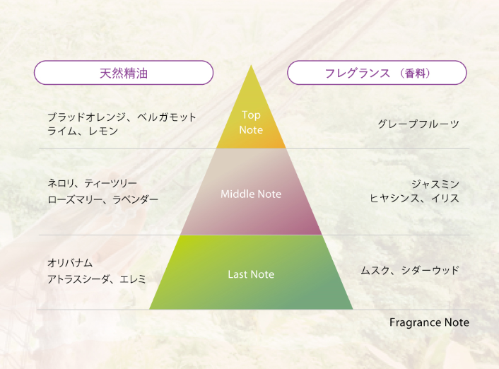 夏らしいシトラスブレンドに、ネロリとフレッシュなハーバルブレンドを合せ、オリバナム、アトラスシーダー、エレミでやさしくまとめたシトラスハーバルウッディ調の香りです。