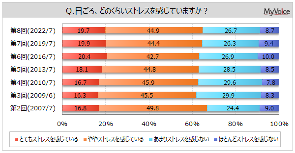 | <今 回>(2022/7)https://myel.myvoice.jp/products/detail.php?product_id=28811 ※上記設問の他に、「ストレスによる身体症状」「ストレス耐性」も聞いています。 <第7回>(2019/7)https://myel.myvoice.jp/products/detail.php?product_id=25210 <第6回>(2016/7)https://myel.myvoice.jp/products/detail.php?product_id=21611 |