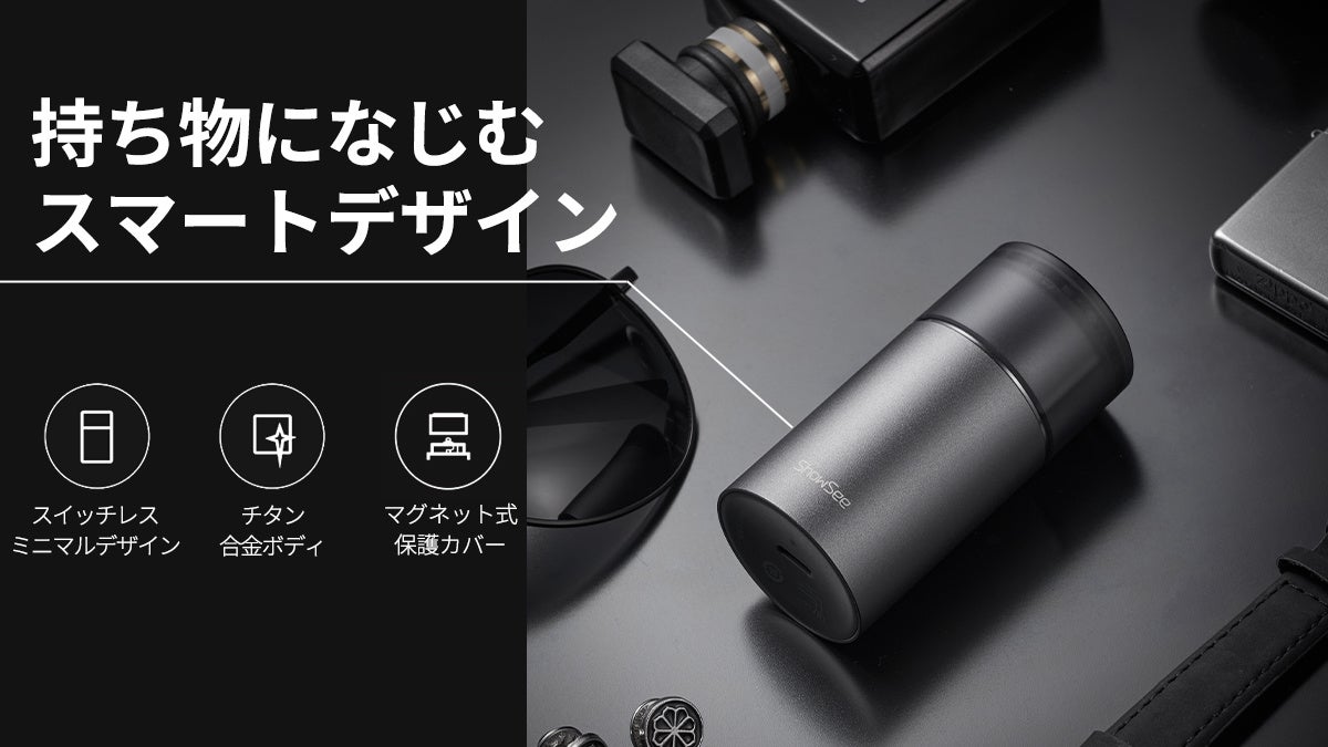 無駄をそぎ落とし、鞄に忍ばせても違和感のないミニマルかつコンパクトなデザイン。センサー起動式なのでボタンやスイッチのない統一されたビジュアルが特徴的です。
