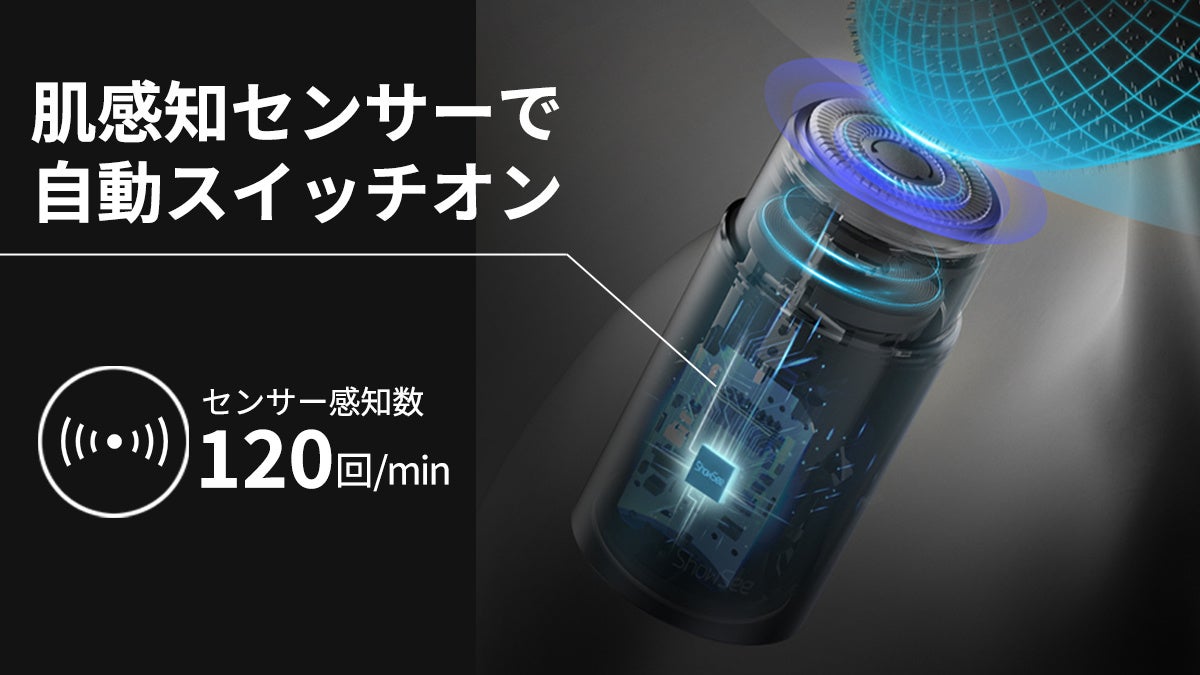 センサーが肌表面の微細な電流を感知し、自動でスイッチオン。ボタン操作なく完全自動でシェービング開始します。肌から離すと自動でスイッチオフし、余計な電力を使いません。