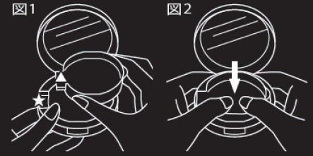 ●セットするときは、レフィル容器のふたは閉じた状態で、レフィルの▲の位置と、ケースの★の位置を合わせて差し込みます。(図1)カチッと音がするまで上から押してください。(図2)