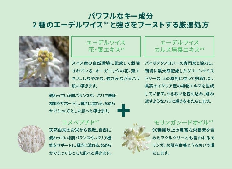 ※1:エーデルワイス 花・葉エキスとエーデルワイスカルス培養エキス(ともに整肌成分) ※2:加水分解コメタンパク(整肌成分) ※3:ワサビノキ種子油(保湿成分)※4:エーデルワイス花・葉エキス(整肌成分)※5:エーデルワイスカルス培養エキス(整肌成分)