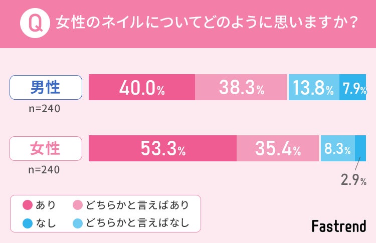 続いて、女性のネイルについてどのように思うか聞き、男女別に集計しました。