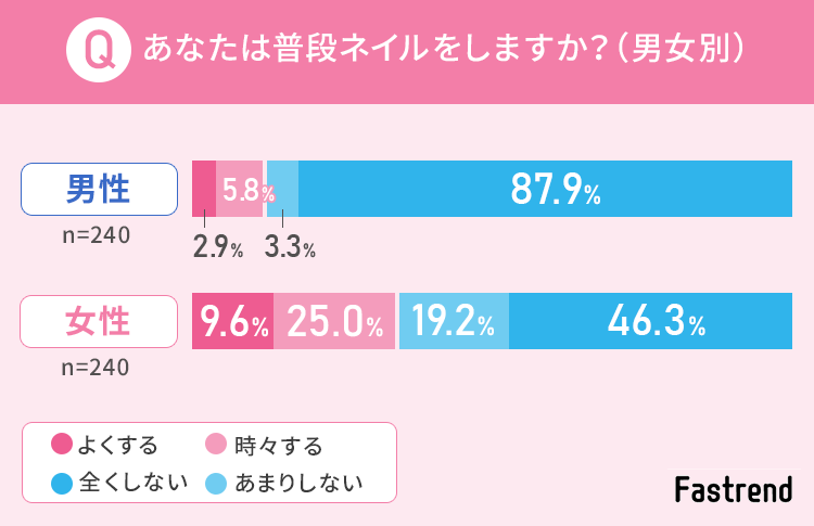 男女別に集計した結果、女性は9.6%が「よくする」、25.0%が「時々する」と回答し、合わせると34.6%の方が普段からネイルをしているようです。
