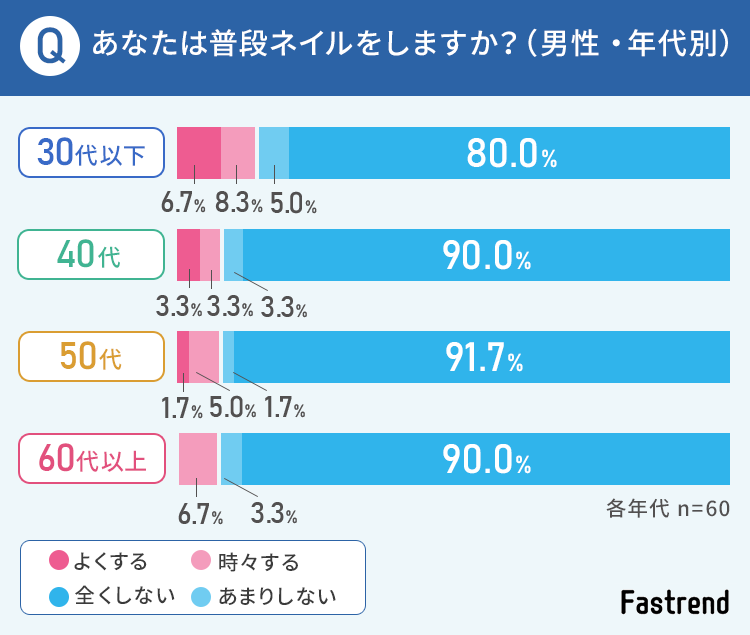 また、男性も15.0%(「よくする」6.7%、「時々する」8.3%)の方が普段ネイルをしていると回答しました。