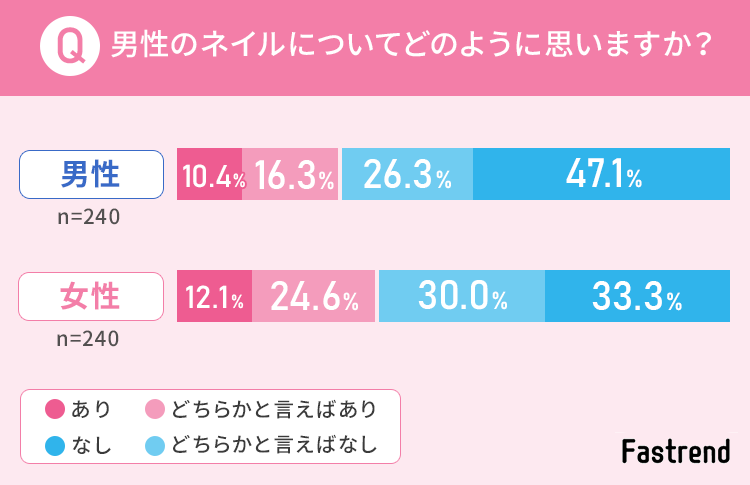 一方で男性のネイルは男女ともに「なし」派が多く、透明なネイルや爪磨きで整える程度なら「あり」だと感じる人が多いようです。