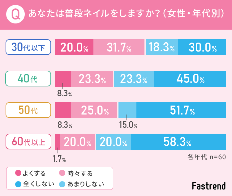 30代以下では、女性の51.7%(「よくする」20.0%、「時々する」31.7%)と半数以上がネイルをしているようです。
