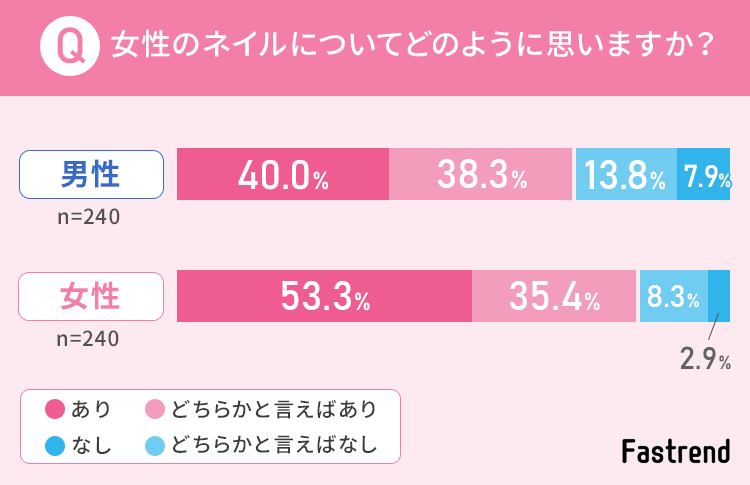 男性では「あり」が40.0%、「どちらかと言えばあり」が38.3%で合わせると78.3%の方が女性のネイルに肯定的なようです。