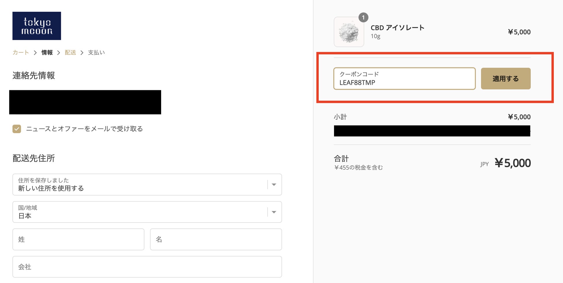 3. 購入画面で画像のようにクーポンコードを入力し、「適用する」を押すと全額割引となります
