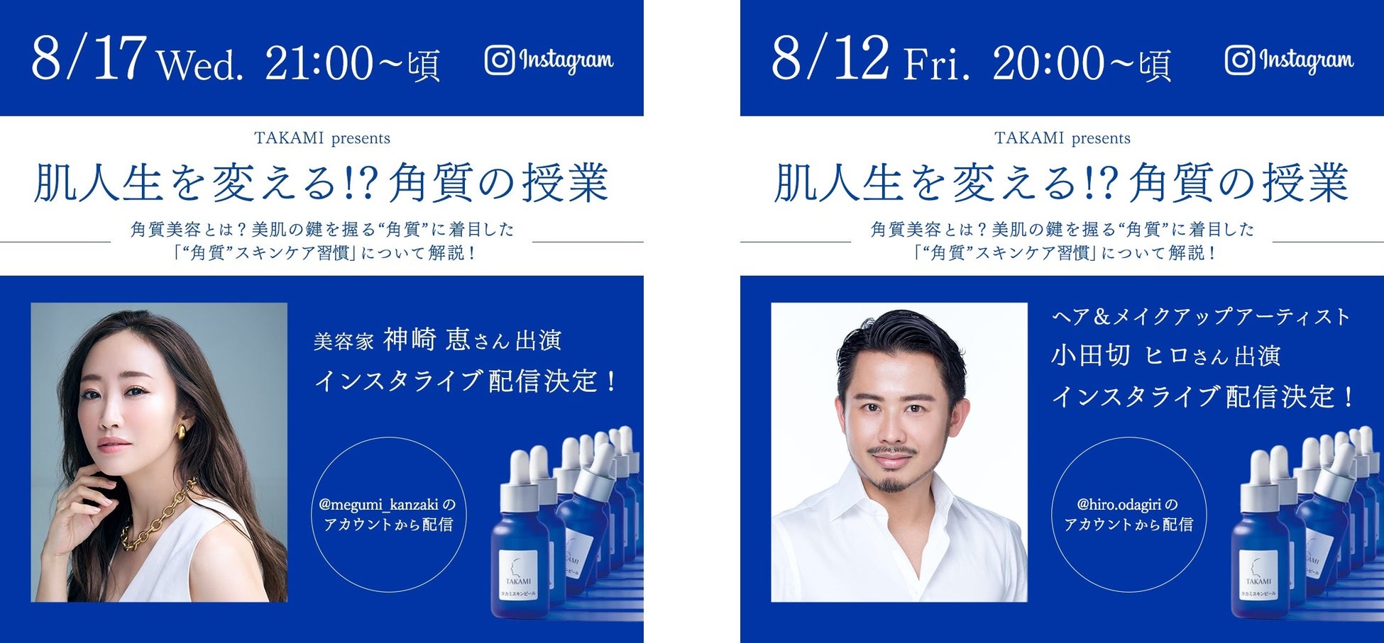 東京・表参道にある美容皮膚の現場で長年にわたりスキンケアの開発に携わってきたドクターズコスメブランド『タカミ』(本社:東京都中央区、www.takami-labo.com) は、この度、InstagramライブTAKAMI presents 「肌人生を変える!? 角質の授業」を2022年8月12日(金)、2022年8月17日(水)の2日間に渡り、2週連続で配信いたします。各回の講師には美容賢者として信頼の厚い小田切ヒロさん、神崎恵さんが、『タカミの提唱する「角質美容®」』を紐解きながら、“角質ケアの大切さ”や“美肌のカギは角質にある”ポイントなどを、ご自身の肌人生にまつわるエピソードをもとにレクチャーいただきます。