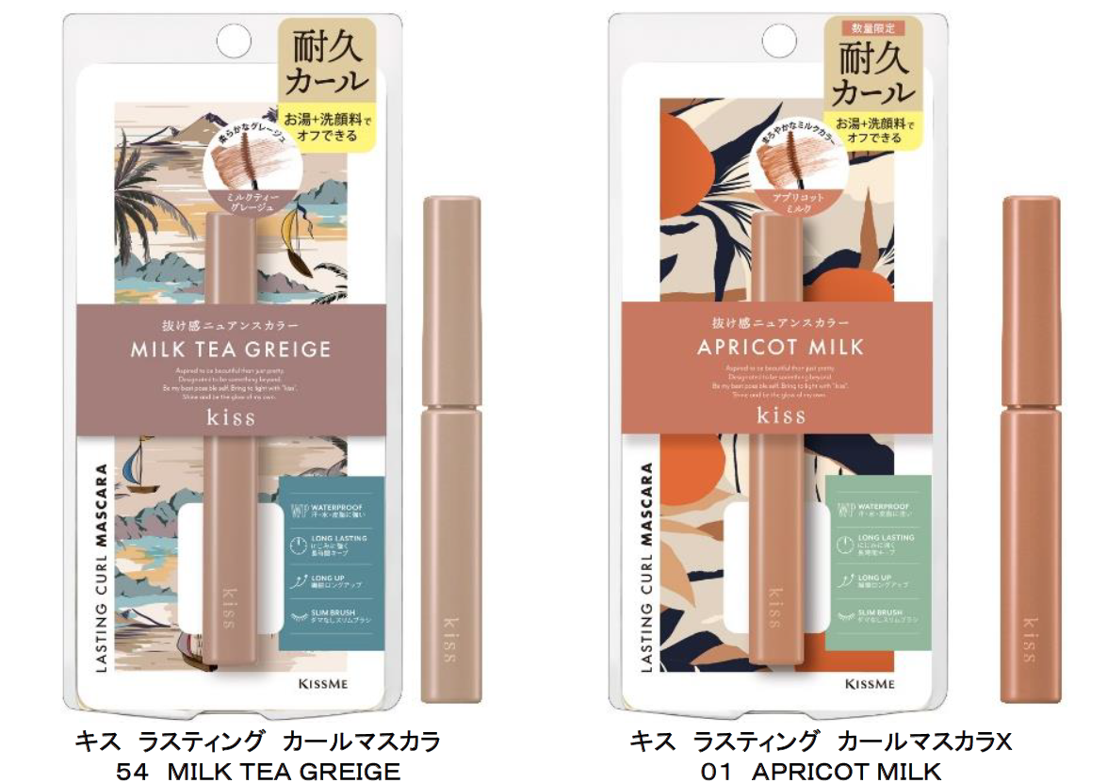 絶妙な抜け感ニュアンスカラーが好評の“kiss”のカラーマスカラから、新色・柔らかな印象を与えるピンクニュアンスのグレージュと、限定色・しゃれ感のあるまろやかなくすみ橙色が登場!