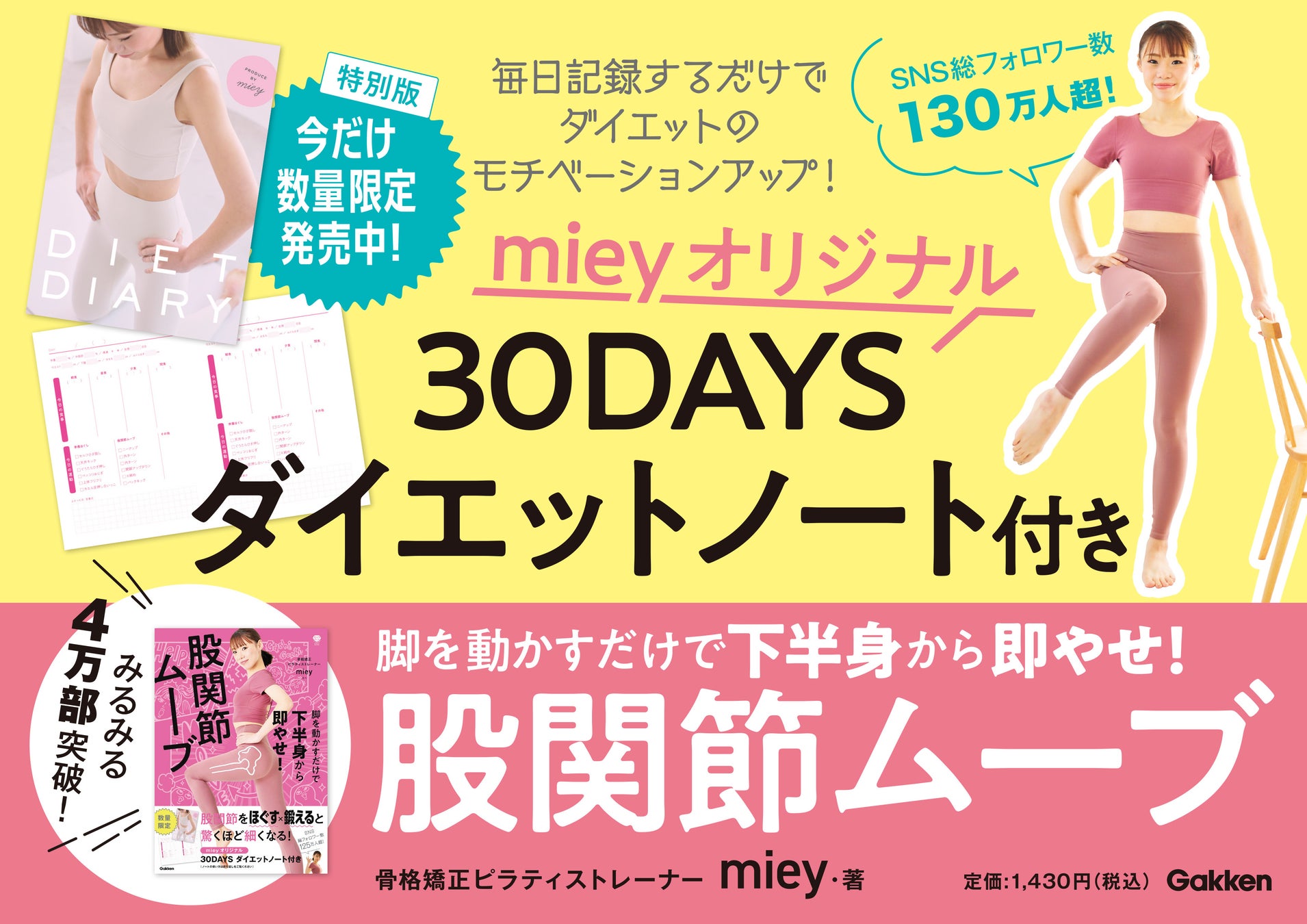 特製ダイエットノートは、毎日のボディデータ、食事・運動内容、1日の振り返りなどを、たっぷり30日分記入できるmieyオリジナル。その日に行った「股関節ムーブ」にチェックを入れる欄もあります。