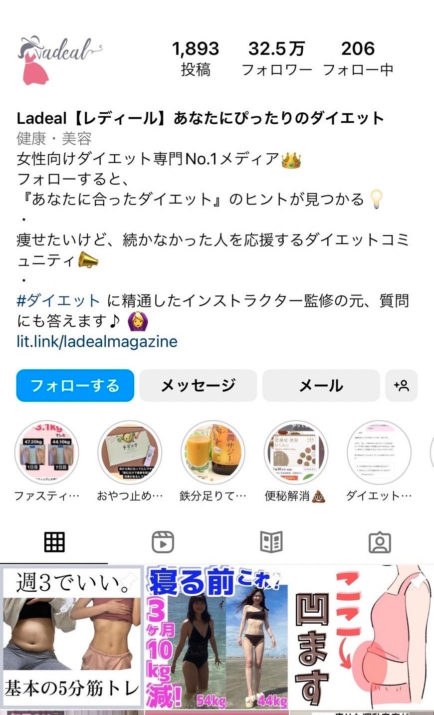 外出自粛でも、自宅で楽しくダイエットメニューを提供したいと考え2020年5月3日に『Ladeal』を開設、‟「あなたに合ったダイエット」のヒントが見つかる“をテーマに様々なダイエット方法を紹介し開設わずか4ヶ月でフォロワー数は10万人を達成!1年後には20万人フォロワーまで伸び続け現在では32,5万人、女性フォロワー数は95%を誇り、女性向けダイエット専門№1メディアとなった『Ladeal』は女性から絶大な支持を受けています。
