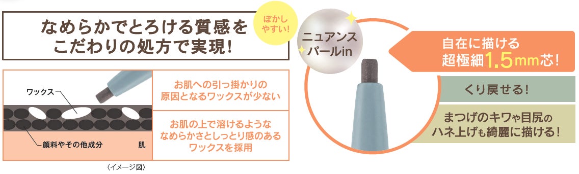 「サナ ニューボーン クリーミーアイペンシルEX」は、ぼかしラインでニュアンスEyeに仕上がるアイライナーです。こだわりの処方で極上のなめらかな描き心地を実現した1.5mmの超極細芯のクリーミーペンシルと、アイメイクの幅が広がるぼかしチップが一体化。1本で簡単に旬な目元が叶います。