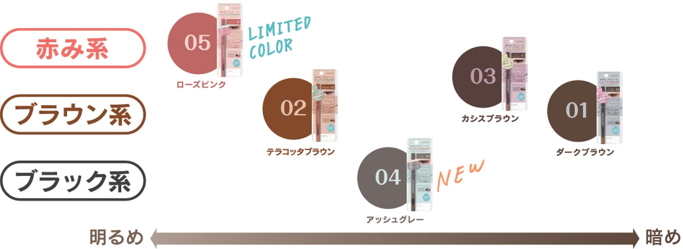 この度の新色「04 アッシュグレー」は目元が際立つ仕込みグレー。ブラックのアイライナーだと色に締まりがありすぎると感じる方でも使いやすい色味です。さらに限定色「05 ローズピンク」は粘膜カラーのくすみピンク。上品な透明感で目元に血色感を仕込みます。上まぶたにひいてぼかせば儚げな目元に、下まぶたにひけば目の重心がさがり、自然にあかぬけた小顔メイクも楽しめます。