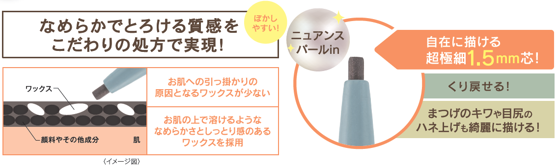 「サナ ニューボーン クリーミーアイペンシルEX」は、ぼかしラインでニュアンスEyeに仕上がるアイライナーです。こだわりの処方で極上のなめらかな描き心地を実現した1.5mmの超極細芯のクリーミーペンシルと、アイメイクの幅が広がるぼかしチップが一体化。1本で簡単に旬な目元が叶います。