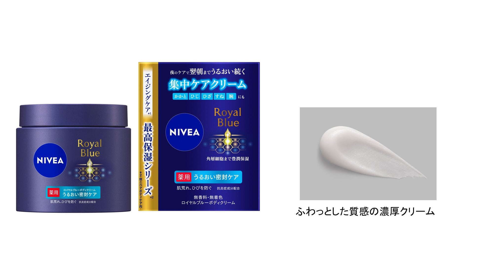 今回新発売する『ニベア ロイヤルブルーボディクリーム うるおい密封ケア』は、ボディケアシリーズ共通成分の角層うるおい成分(*4)をはじめ、うるおい密封成分(*5)を配合。角層細胞までうるおいを満たし、しっとりやわらかな肌に導きます。夜のケアで翌朝までうるおいが続きます。また、抗炎症成分:グリチルリチン酸ジカリウム(有効成分)配合で、肌荒れやひびを防ぎます。