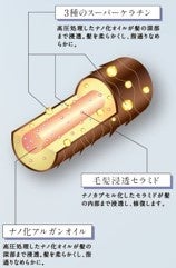 分子の大きさの違う3種のスーパーケラチン(※1)とナノカプセル化した毛髪浸透セラミド(※2)が髪の毛一本一本まで浸透して補修。高圧処理したナノ化アルガンオイル(※3)が髪の深部まで浸透することで、髪を柔らかく指通りなめらかに仕上げます。