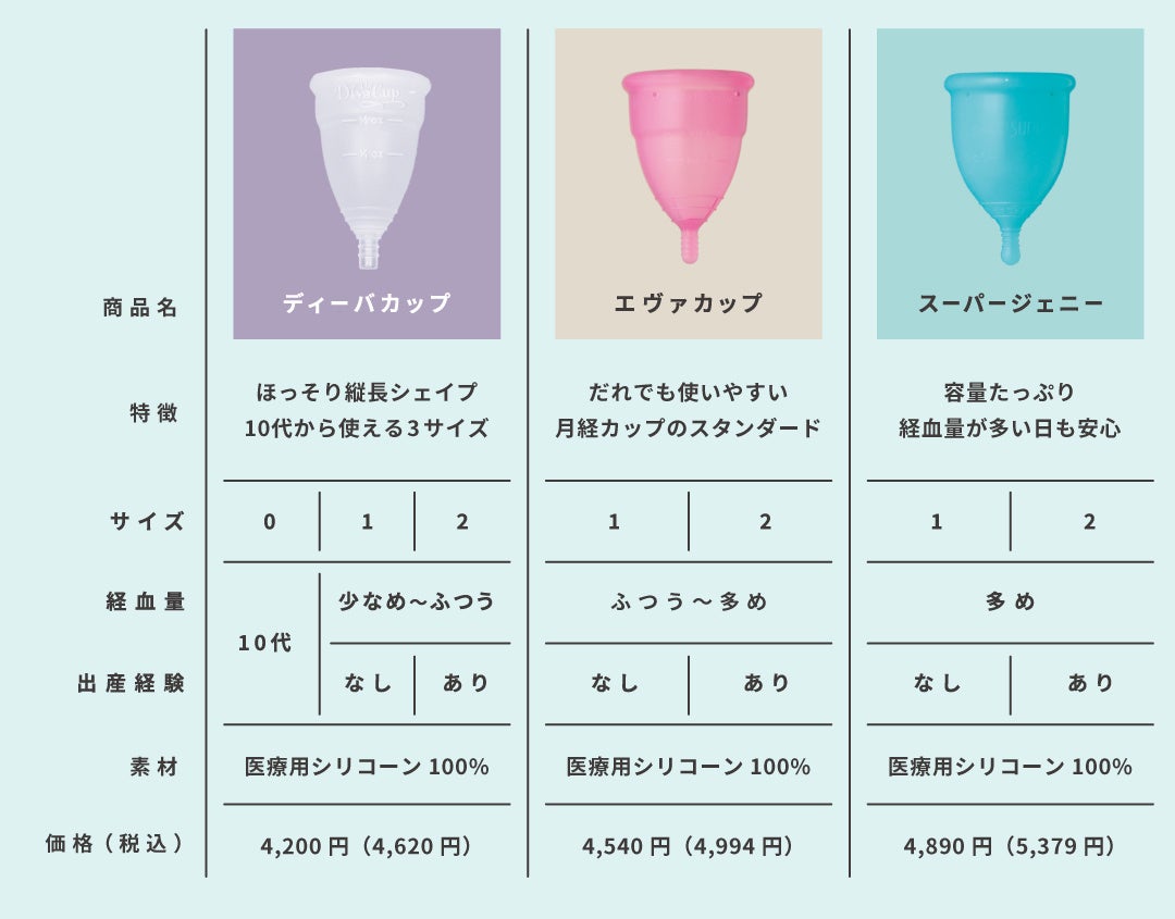 月経カップ選びの参考として、5つの質問に答えるだけで、あなたに合う月経カップを提案する「月経カップ診断」もご用意しています。