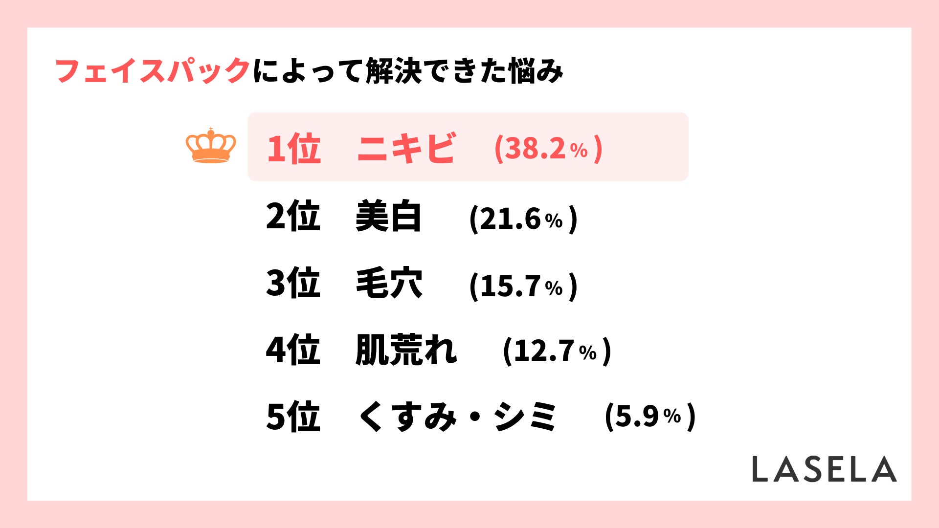フェイスパックでどんな美容の悩みを解決できたのか質問したところ、TOP3は「ニキビ」、「美白」、「毛穴」の順となりました。