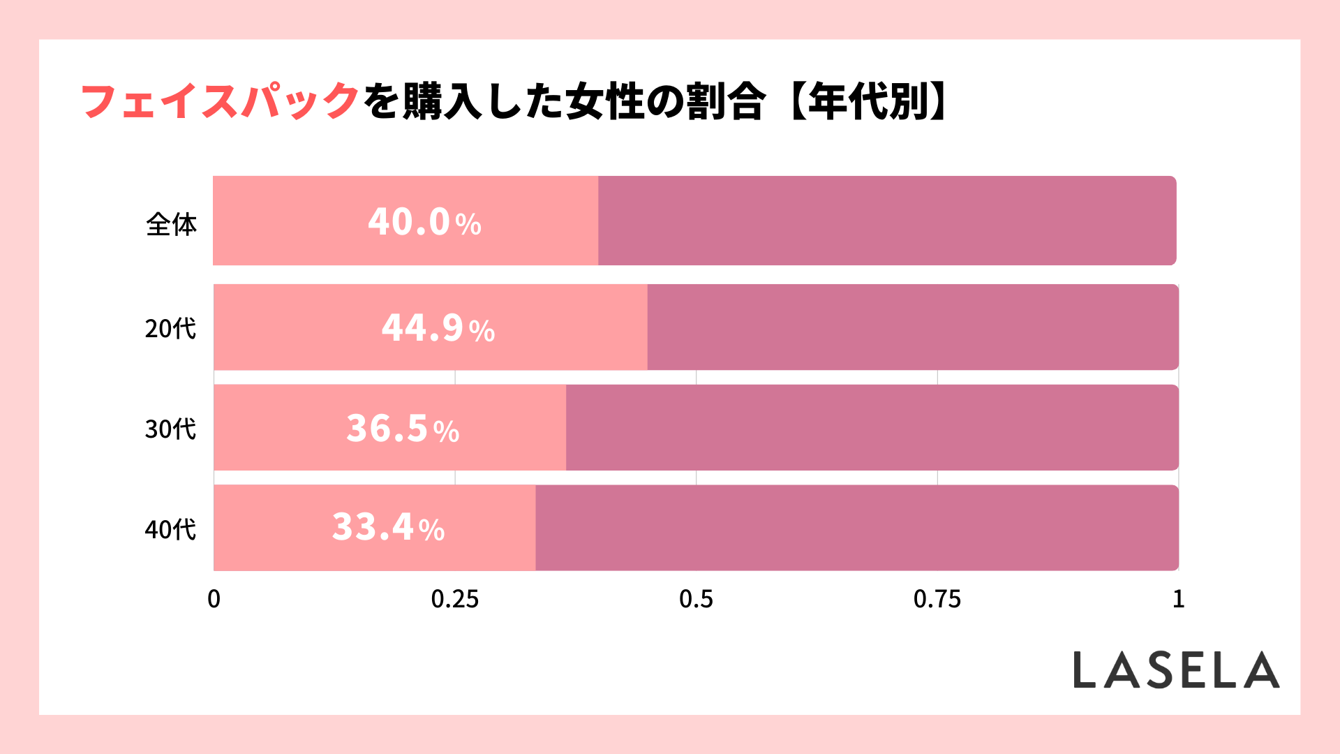 この結果を世代別で見てみると、フェイスパックを購入した割合が最も高かったのは20代で44.9%、およそ2人に1人が美容の悩みを解決するためにフェイスパックを購入しています。