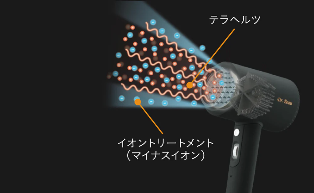 W遠赤外線を発生させる事で 髪の水分を振動させて熱や風量に頼らずに 乾かすことが可能。