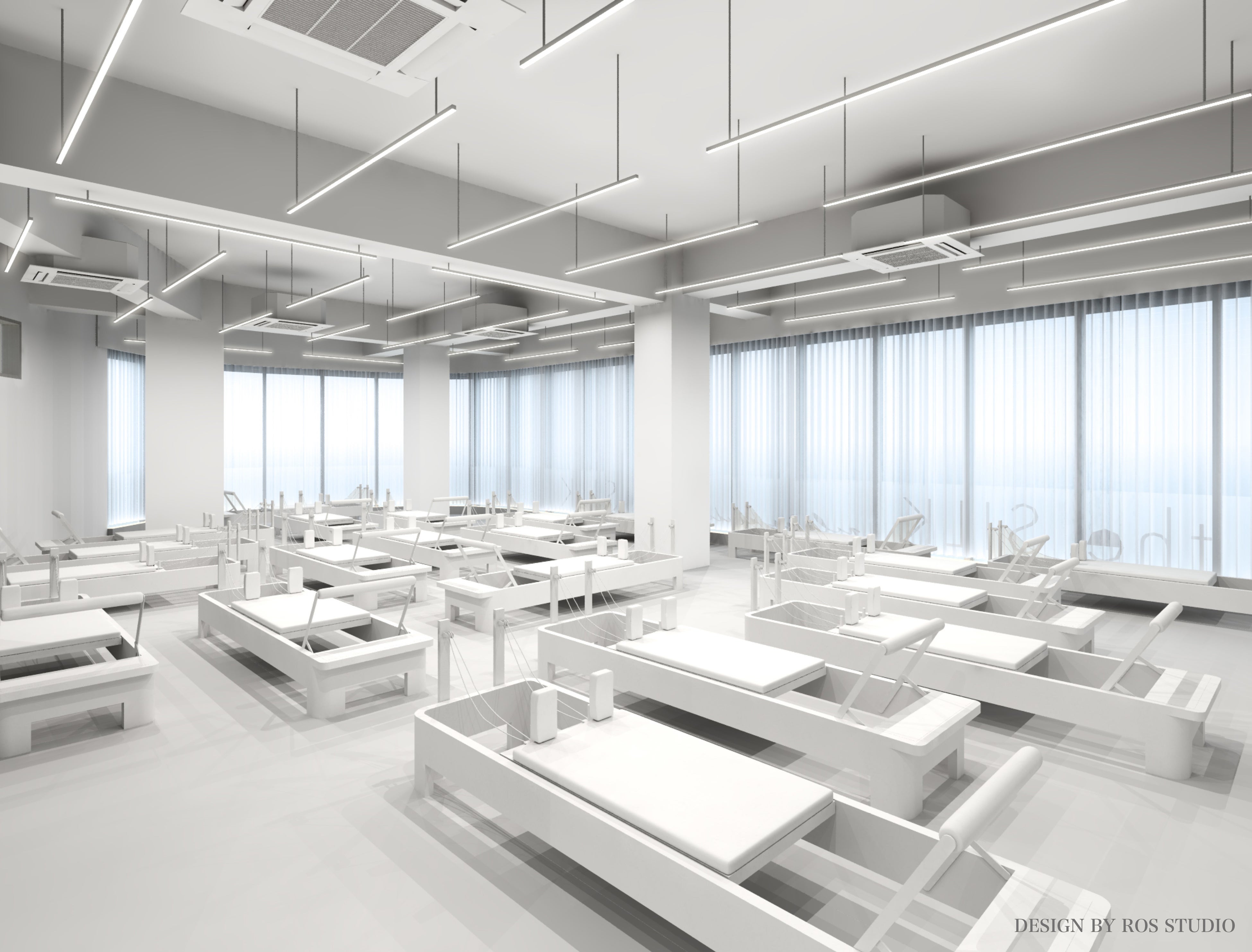 開放的なグループレッスンスタジオはどの角度からもインストラクターが見えるデザインになっています。
