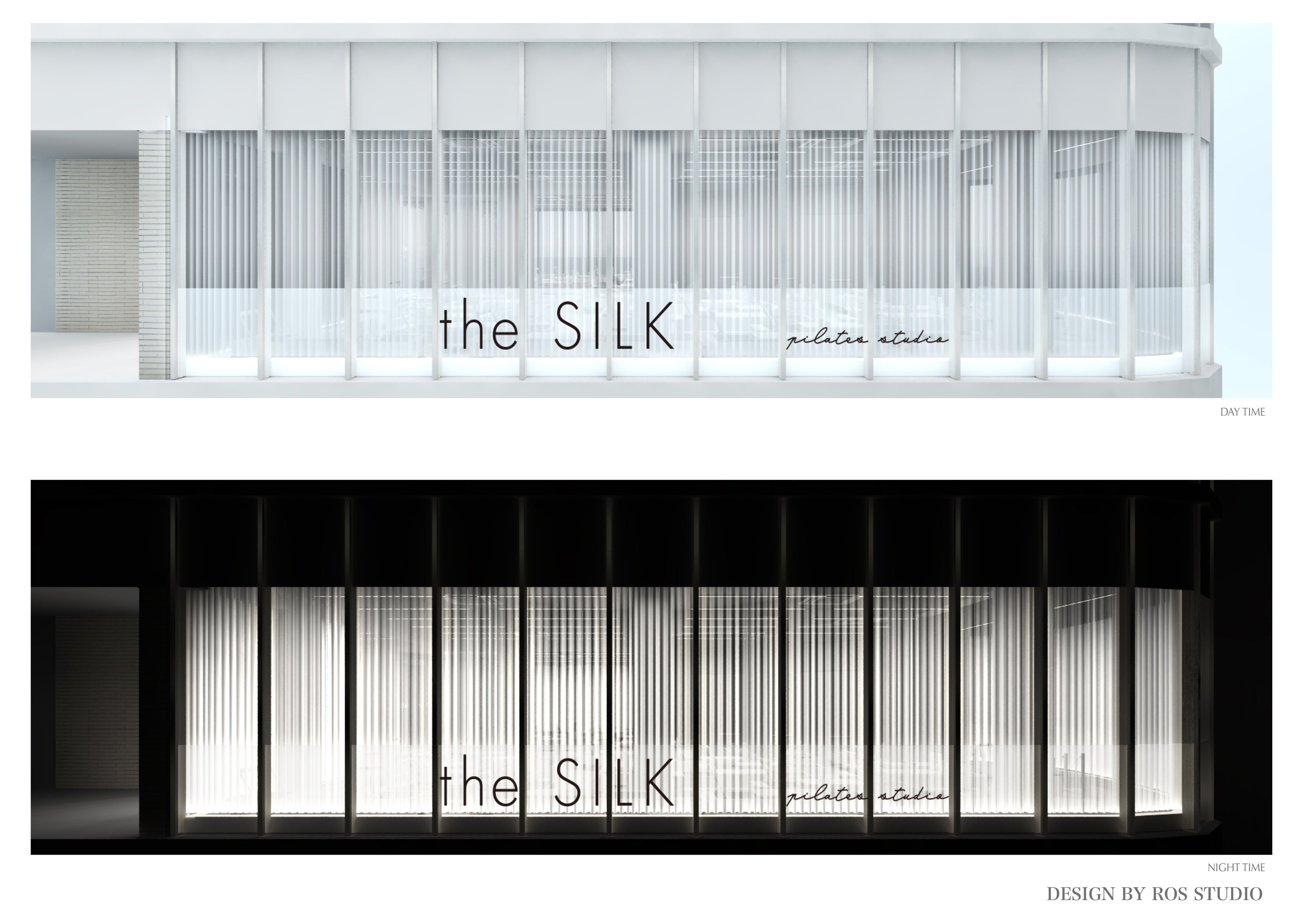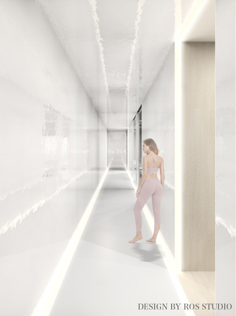 スタジオまでの廊下も白を基調とし、the SILK(ザ・シルク)のロゴが入った壁一面の全身鏡が特徴です。