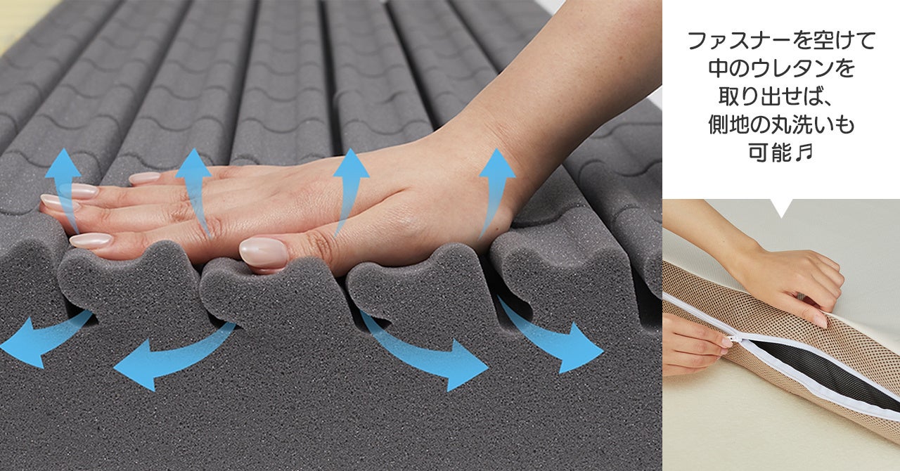 ”threep room (スリープルーム)”の凹凸構造は、ウレタン構造の間から空気が逃げるので、熱や湿気が内部にこもりにくい構造です。