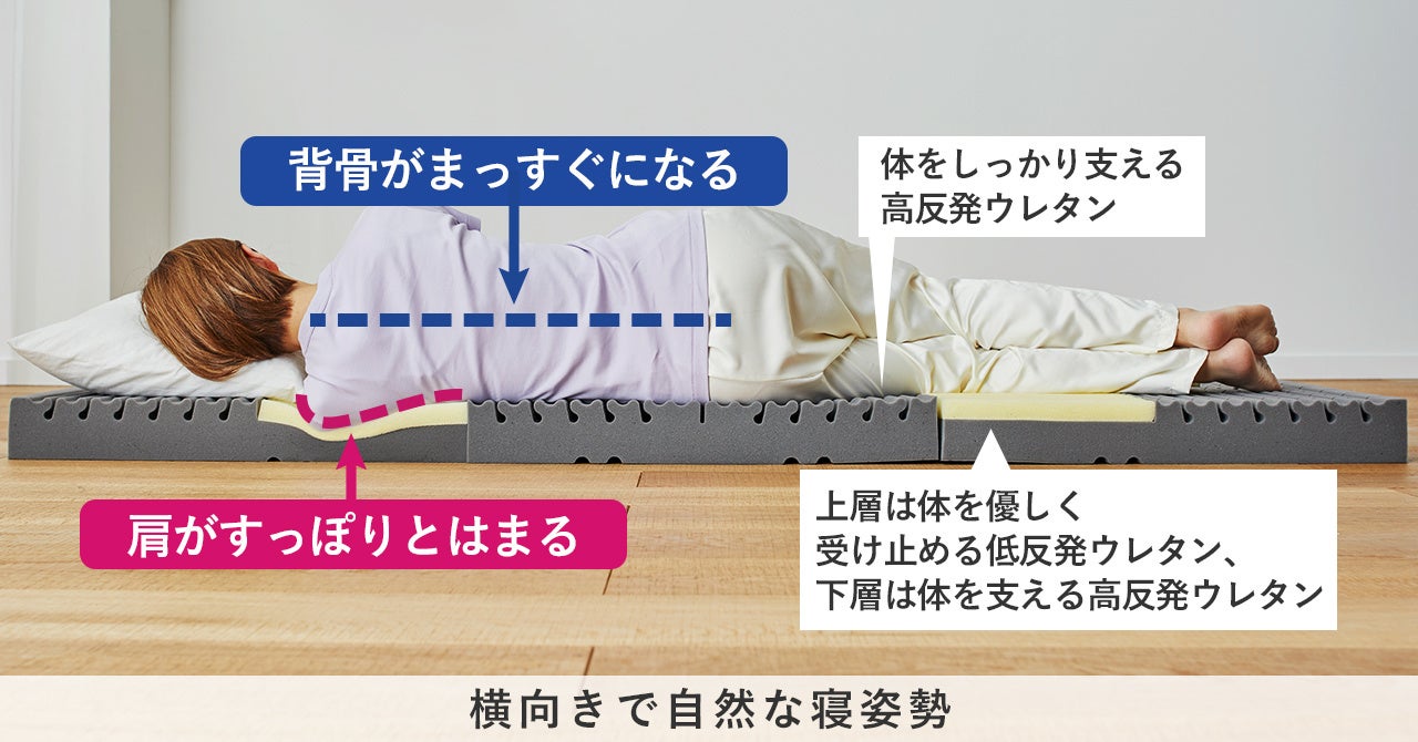 横向き寝時には、肩口が低反発ウレタン部分に接し、またストライプ形状が肩にフィットするので、肩幅の高さによる身体の歪みが生じづらいです。