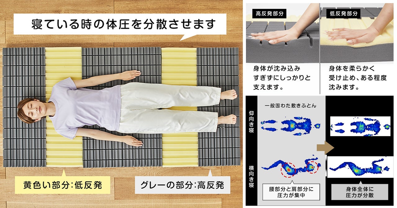 一般的な敷きふとんと比較して、横向き寝でも肩と腰部分の体圧が分散しています。